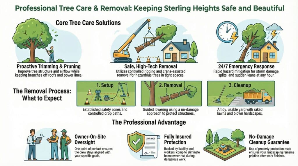 Get dependable tree care for your home or business in Sterling Heights with one crew that handles everything from routine trimming and pruning to removals, stump grinding, and 24-hour emergency response.